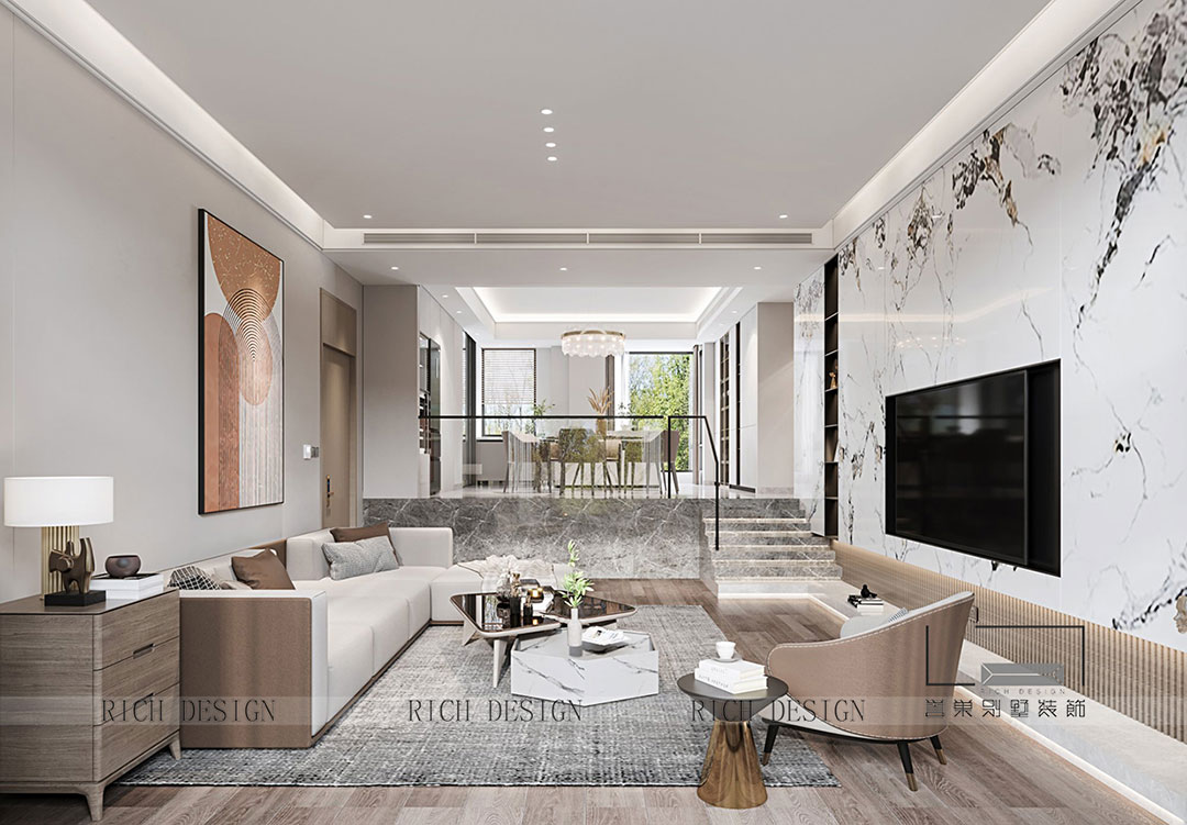 開放式布局是形式和精神的交匯融合,通過大理石和暖棕的色彩構(gòu)成來渲染氛圍,描摹了高級(jí)階層向往的休閑生活場(chǎng)景。