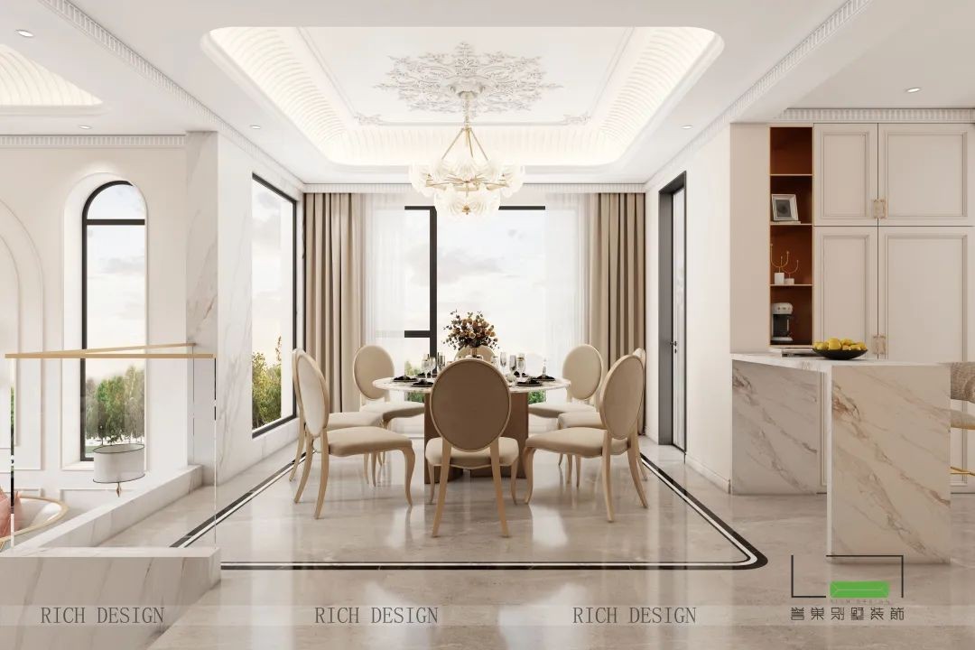 餐廳清麗的水晶吊燈與高大的石柱結(jié)合,讓大氣的法式更有輕奢范。充滿質(zhì)感的潘多拉奢石與熱情似火的壁爐,以及唯美的花藝和白色精致的繡花桌布,不僅提升了客廳的品味格調(diào),更增添了時(shí)尚的視覺感。