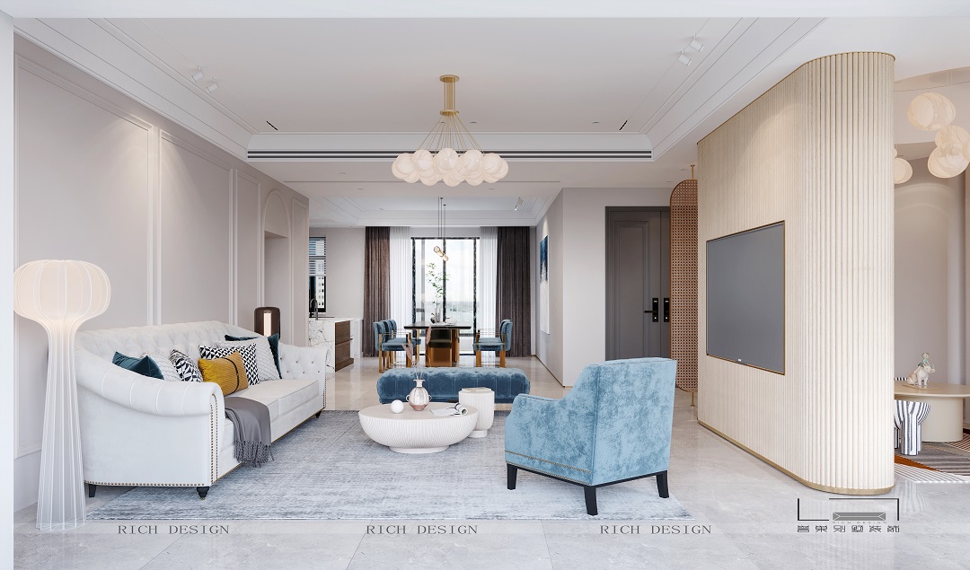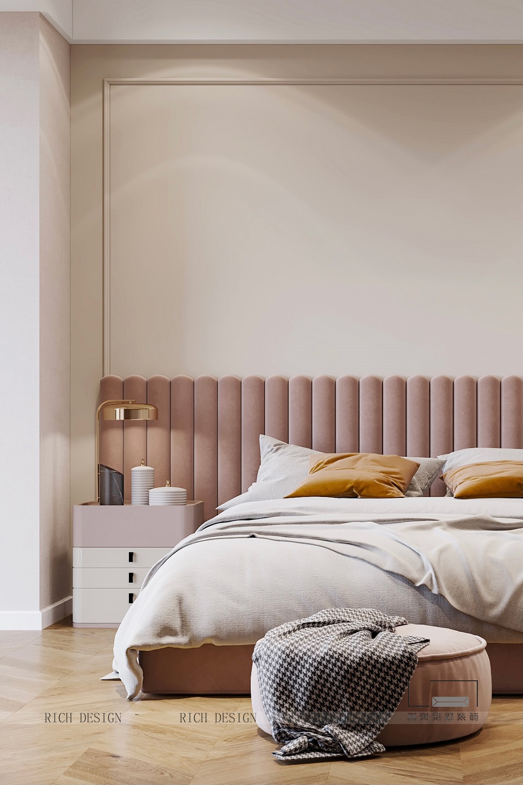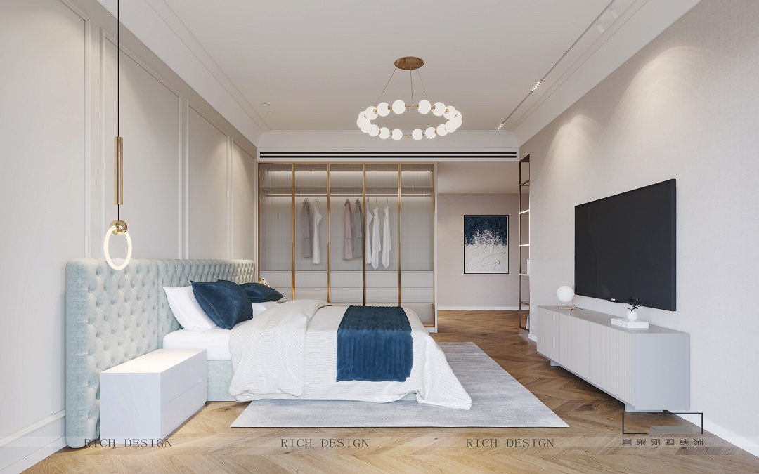 在立面上,將線性元素以空間圍合的方式貫穿其中,簡致,流暢,搭配簡歐輕奢家具,干凈素雅。結合大理石和金屬的紋理走向,讓空間背景兼具美觀舒適的同時,植入安靜純粹的精神觀感。