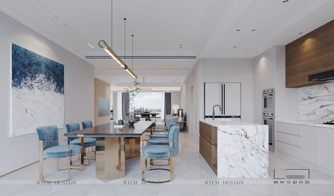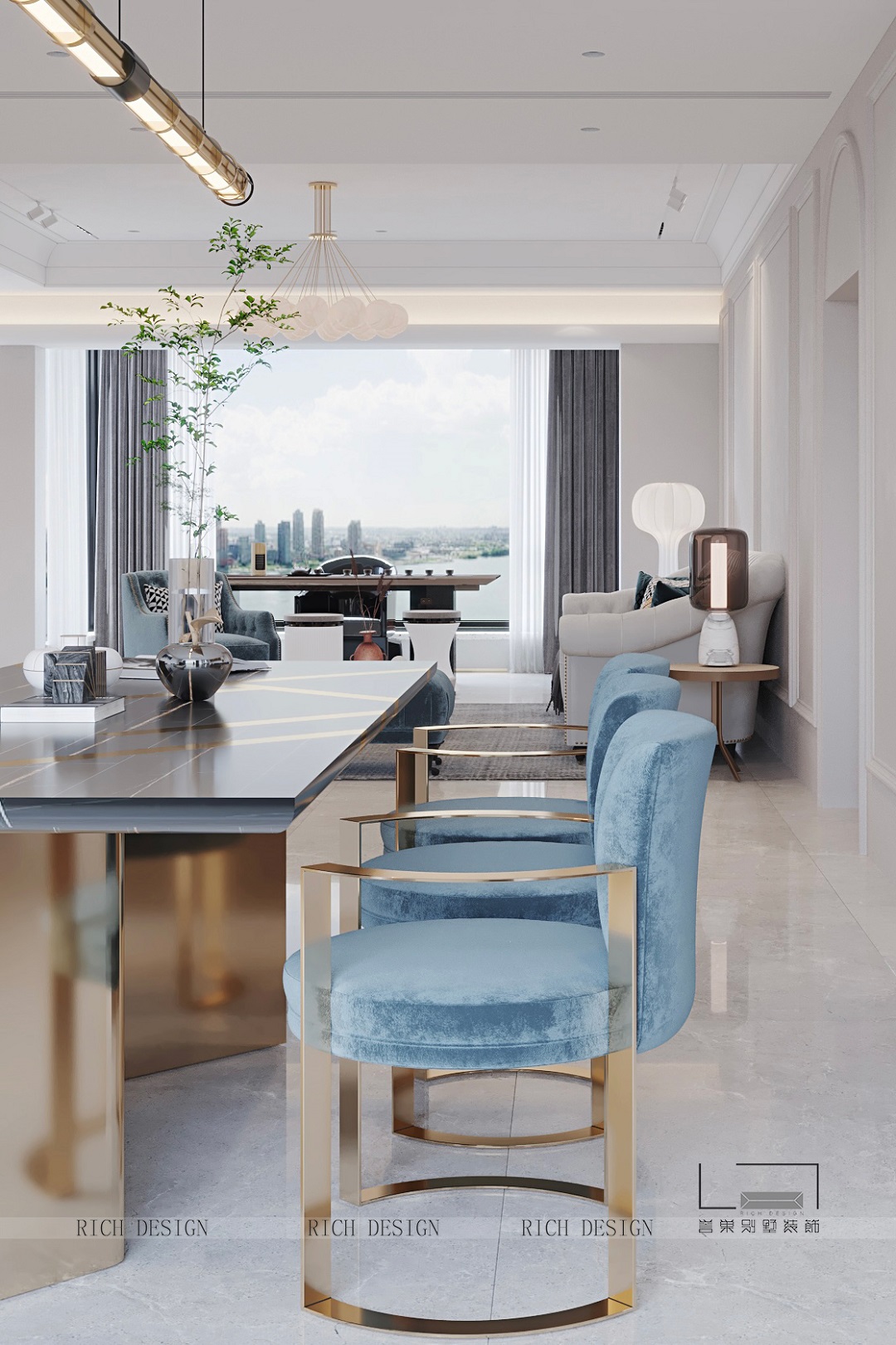 從客廳進入到餐廳,簡歐墻線與黃銅輕奢外表交匯出典雅大氣的魅力,大理石幾何拼接地板與墻上意象元素采用藝術的形式融入到生活設計。