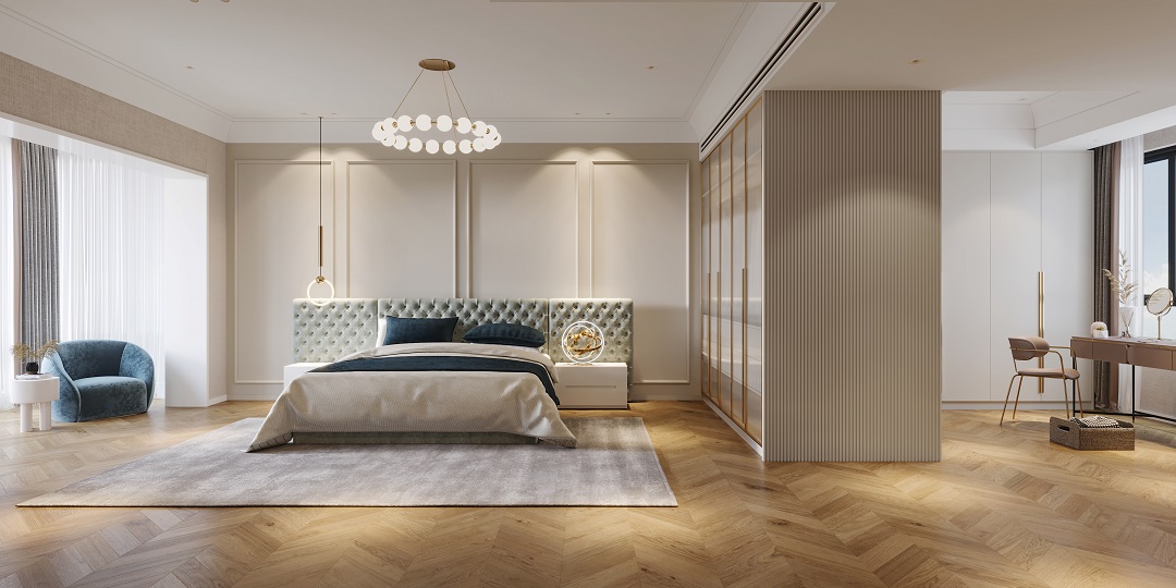 主臥套房內設起居室、衣帽間和主衛(wèi),各功能區(qū)呈遞進式布局。