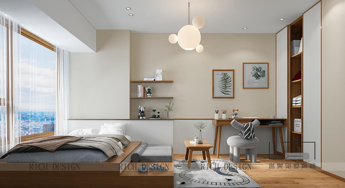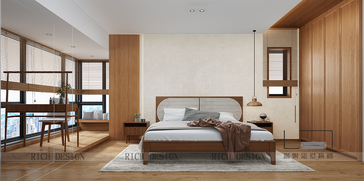 主臥整體色系以原木色為底色,家居用品類選用同色系的顏色,打造出來的原木風才自然,借用外在自然景色,為室內(nèi)帶來無限生機,選用材料上也特別注重自然質(zhì)感。