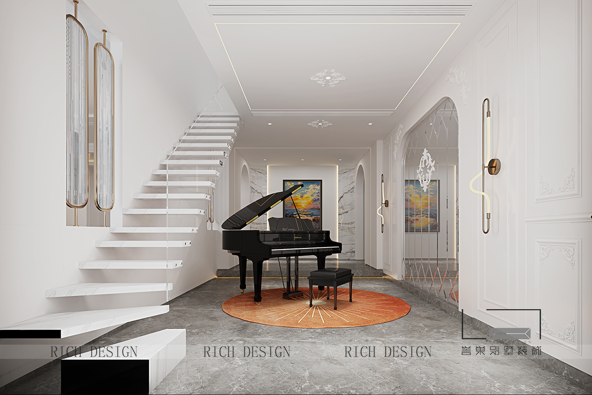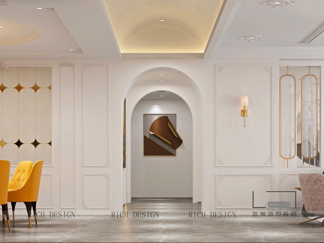 設計師在傳統(tǒng)法式的基礎上衍生出有新法式面貌的風格,在保留法式的傳統(tǒng)裝飾圓度下做簡化處理,形態(tài)簡約而不失奢華,打造利落率性的氣質,呈現出時尚與奢華的空間。