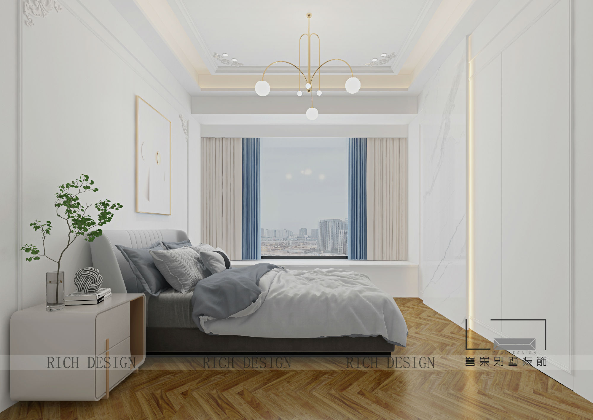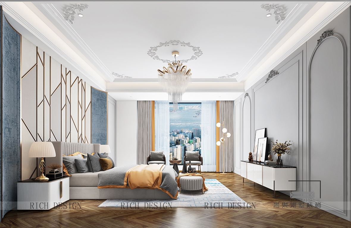 在臥室的總體設計上,設計師摒棄傳統(tǒng)法式的繁復、冗雜的裝飾造型與甜膩的色澤,轉而用經典軸線、對稱布局的方式,結合淡雅的空間色調或幾何線條與典雅時尚的陳設軟裝,打造出一個法式輕奢主義的居住格調。