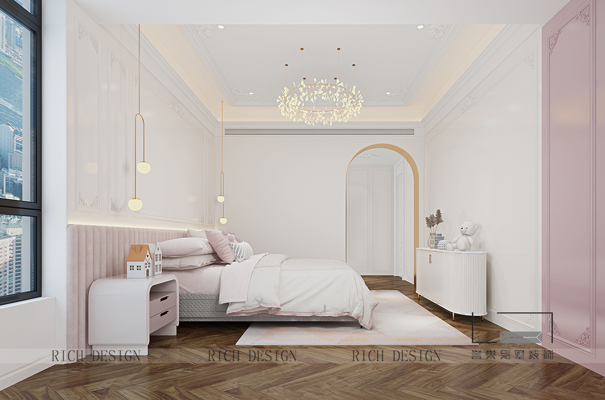 女孩房致力于打造專屬的秘密花園,通過簡約少女粉、城堡弧形門與時尚結合的家具,讓人彷佛置身在南法普羅旺斯的法式城堡中,營造出典雅唯美氣息。