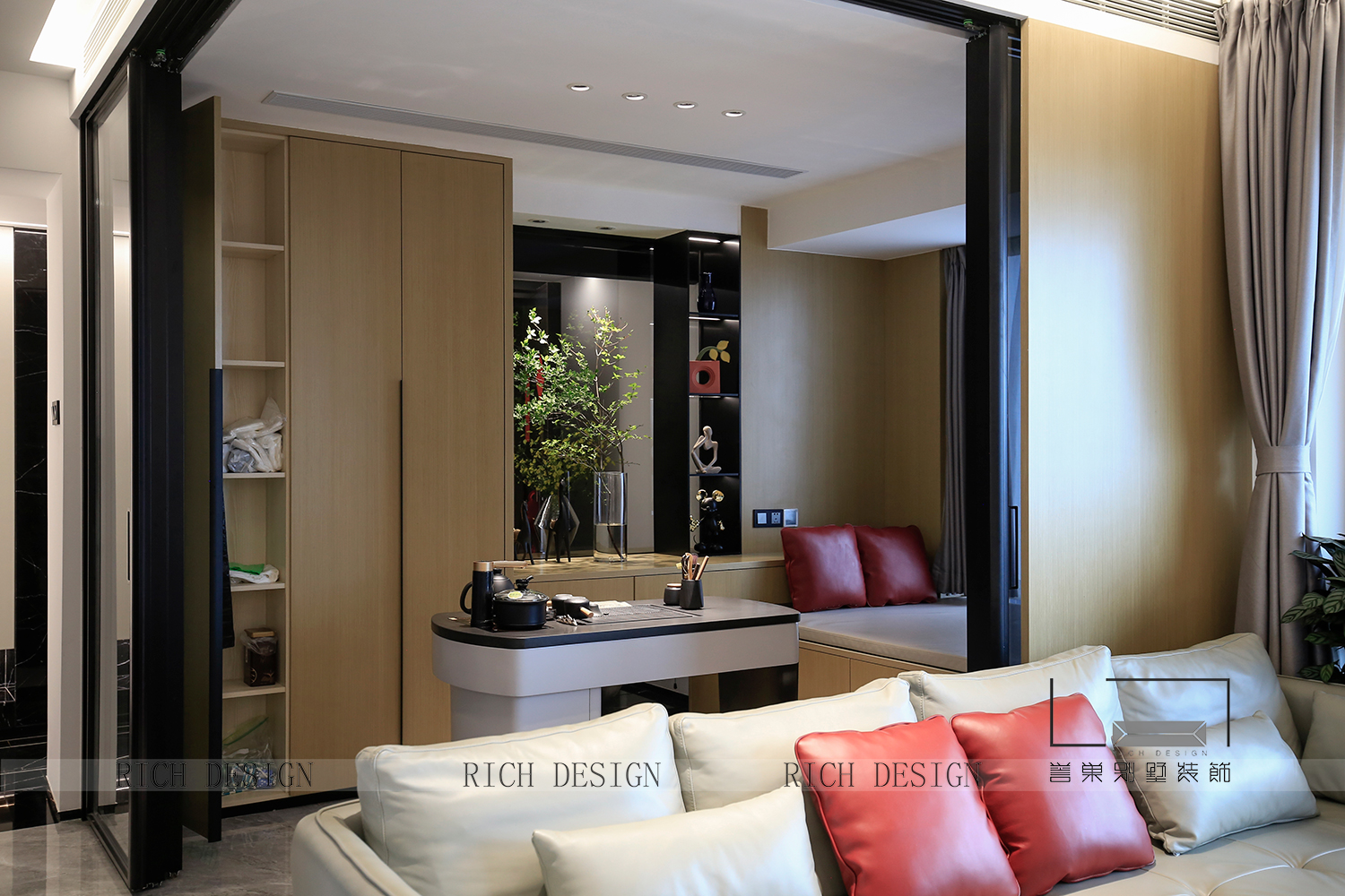 開放式布局讓生活的尺度和待客的氣氛盡情延展, 餐桌方寸之間,客廳與茶室之間,承載生活的理想與美好。大地色空間加以高貴紅抱枕,自然簡單的內(nèi)核張弛有度,蘊含當(dāng)代設(shè)計的美感與深度。