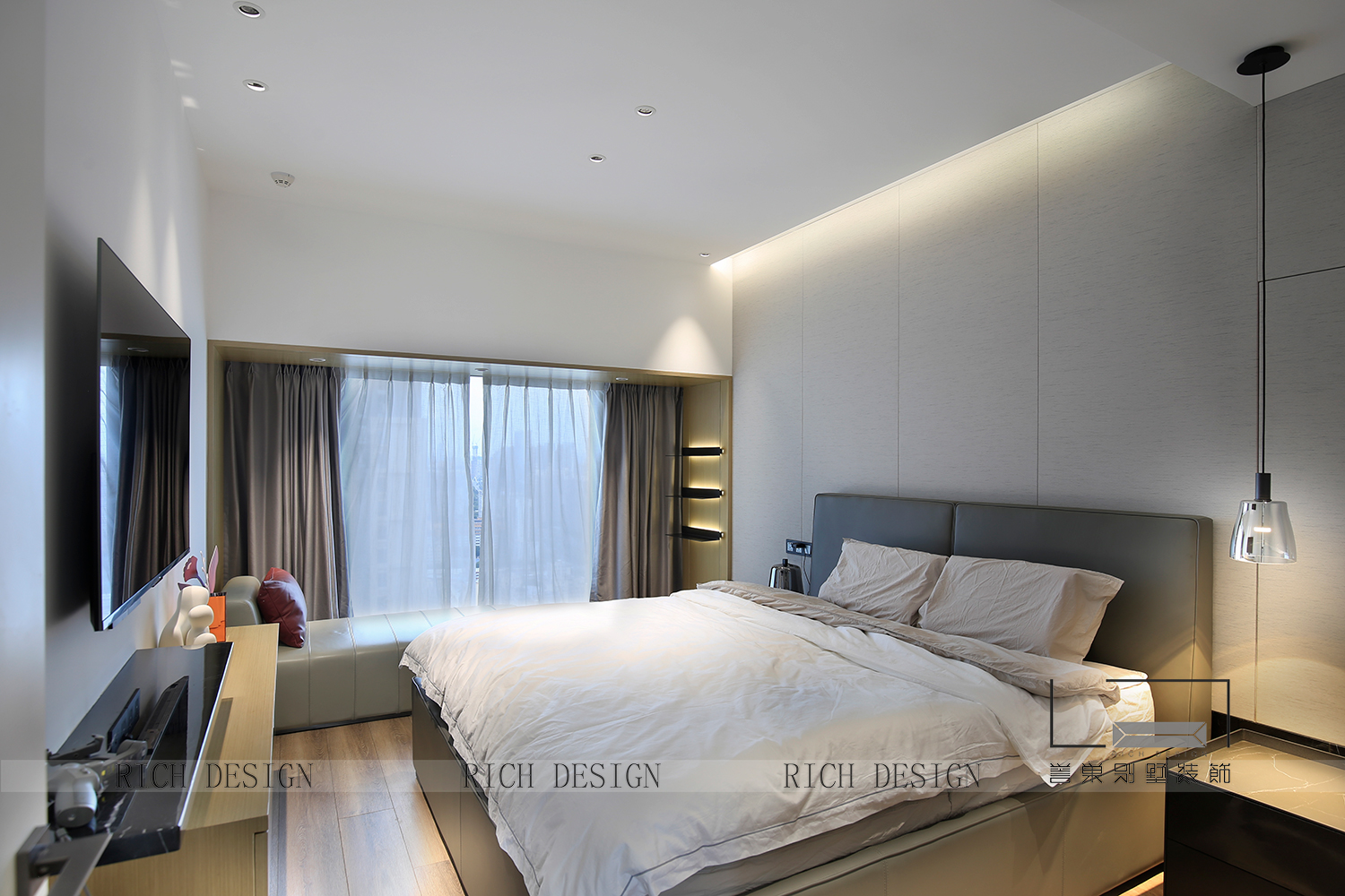 主臥的設(shè)計延用了客廳的整體格調(diào),與化妝間衣帽室無縫連接業(yè)主的需求,簡單隨意,又不失優(yōu)雅精致。在晨光微曦中醒來,獲取自由呼吸的快感,一切都是那么圓融自在、寧靜安詳。