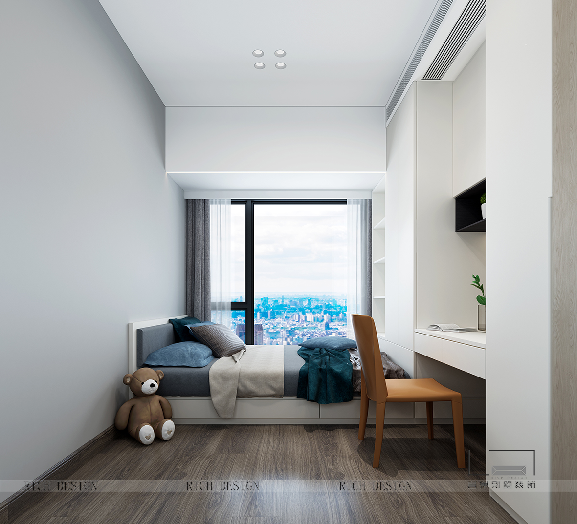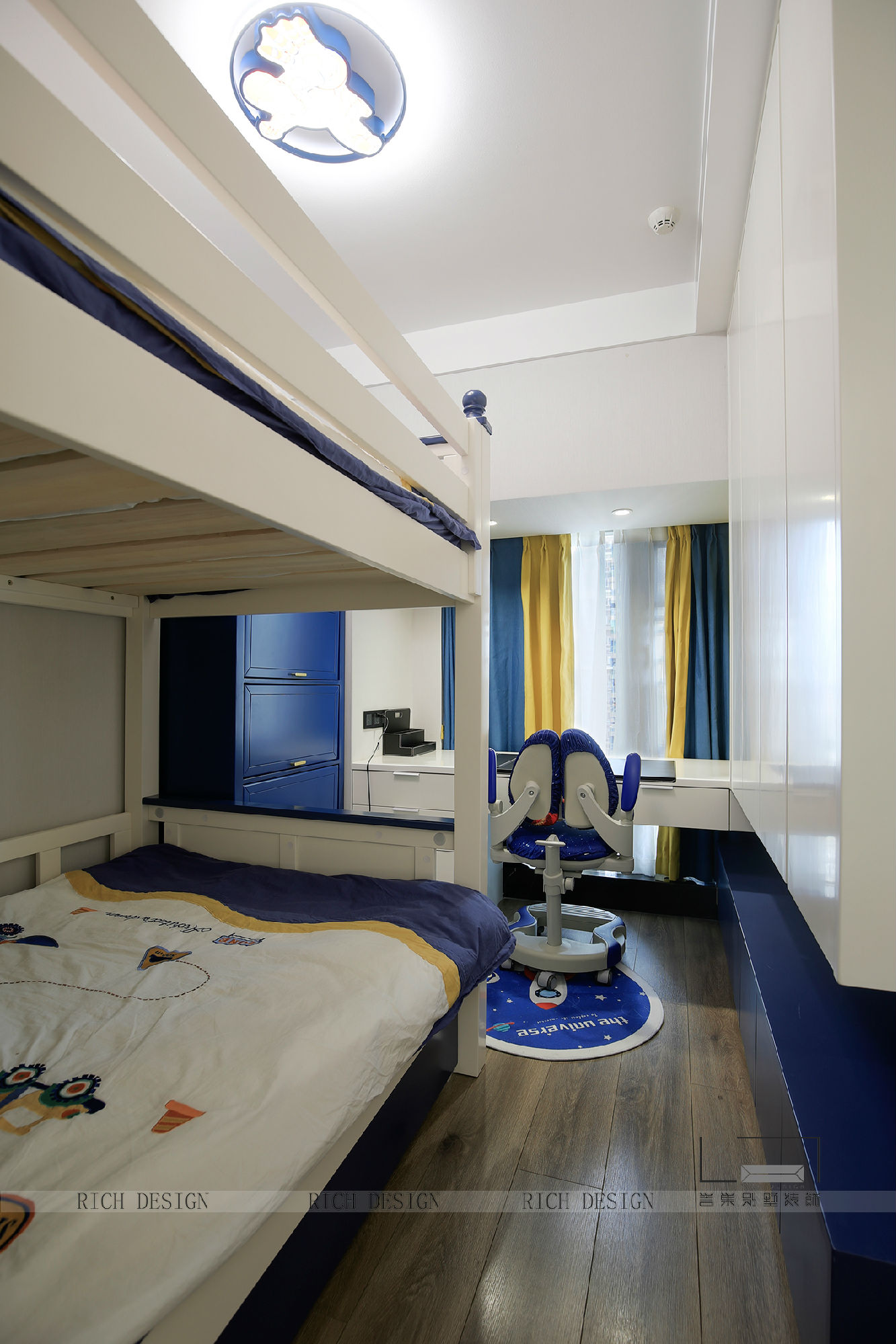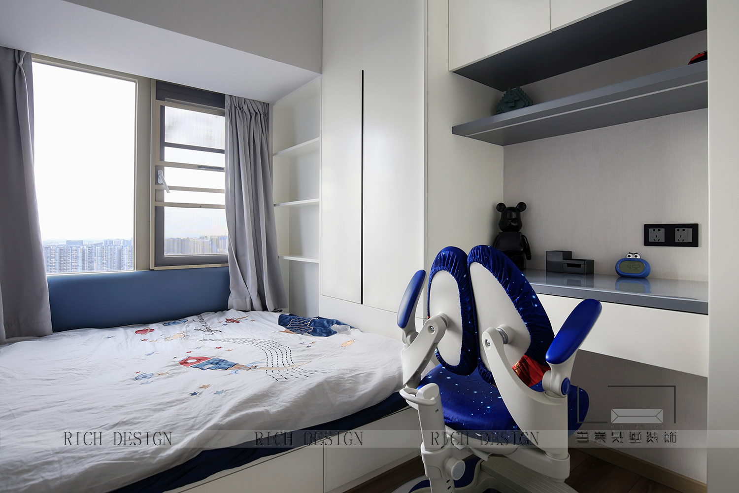 足夠?qū)挸ǖ拈L條形書桌與收納柜,讓愛不釋手的書籍與玩具都能安穩(wěn)存放。一個簡約干凈的空間,留給孩子自己慢慢點綴。